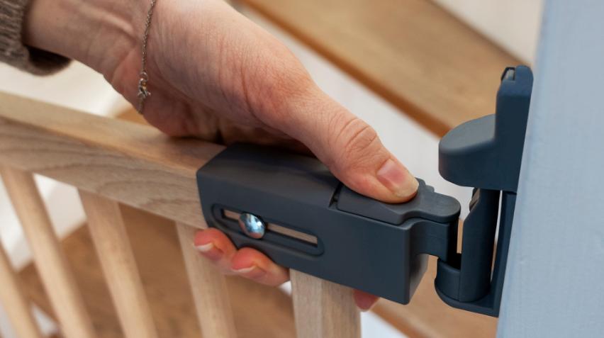 Grinden er spesialdesignet for å sikre trapper - spesielt trapper med spiler. Det er laget med en innovativ klemme på den ene siden som omslutter trappestolpene på en sikker måte, mens den andre siden festes til veggen med skruer. Dermed er det ikke lenger nødvendig å bore hull i trappestolpen eller balustrene. Klemmen passer til vertikale, rette spiler (1,4-6 cm i diameter) og firkantede trappestolper (5,5-9,5 cm). Det justerbare designet gjør at grinden passer til alle åpninger med en bredde på mellom 74,5-114 cm.