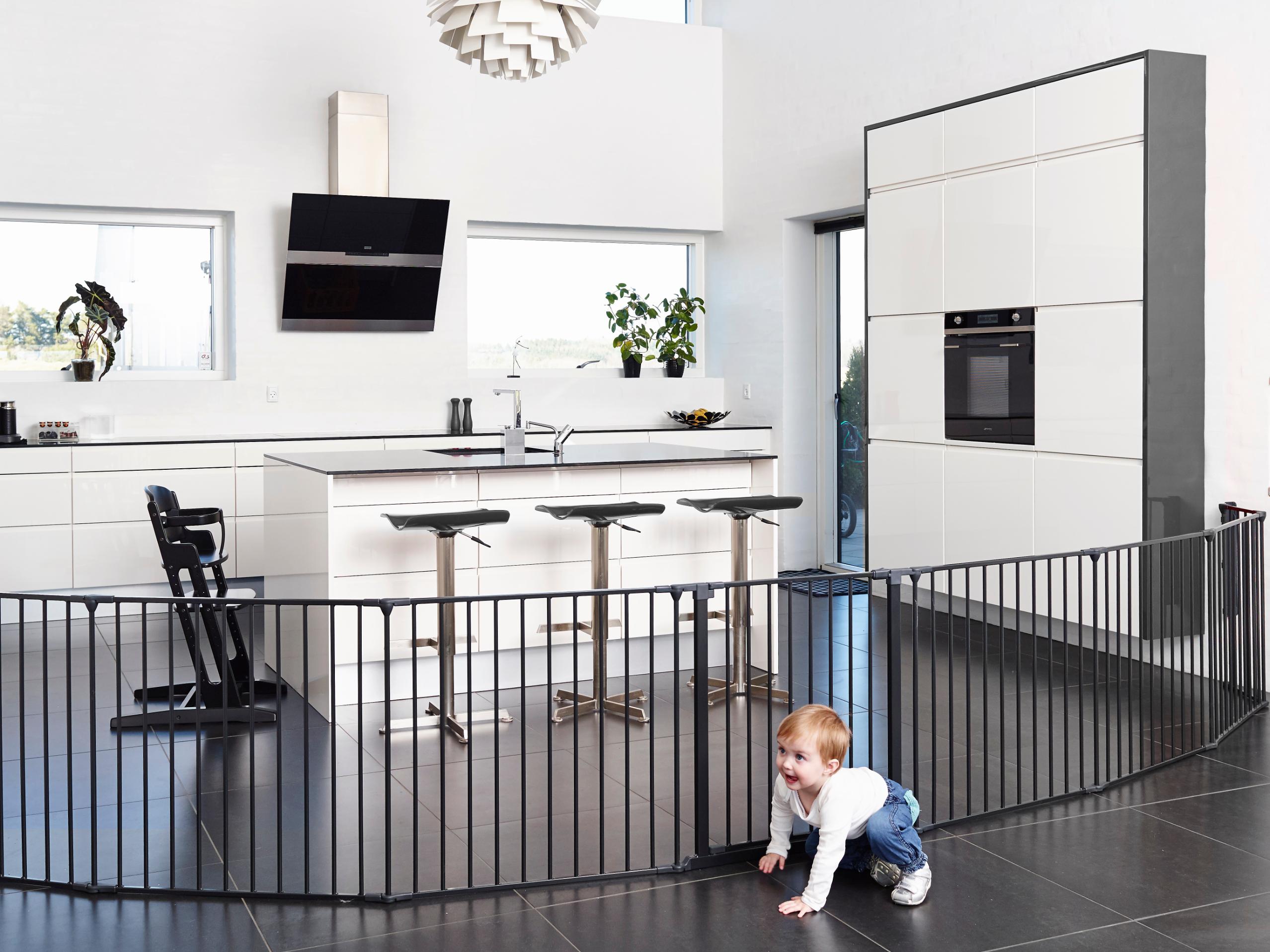Hvis du har et åpent kjøkkenallrom, kan det være en god ide å avskjerme barnet ditt fra selve kjøkkenet. Så du kan lage mat uten å måtte bekymre deg for hvor barnet ditt er og hvilke kjøkkenskap han eller hun er i gang med at tømme. Samtidig blir det lettere å holde øye med barnet ditt på den andre siden av grinden.