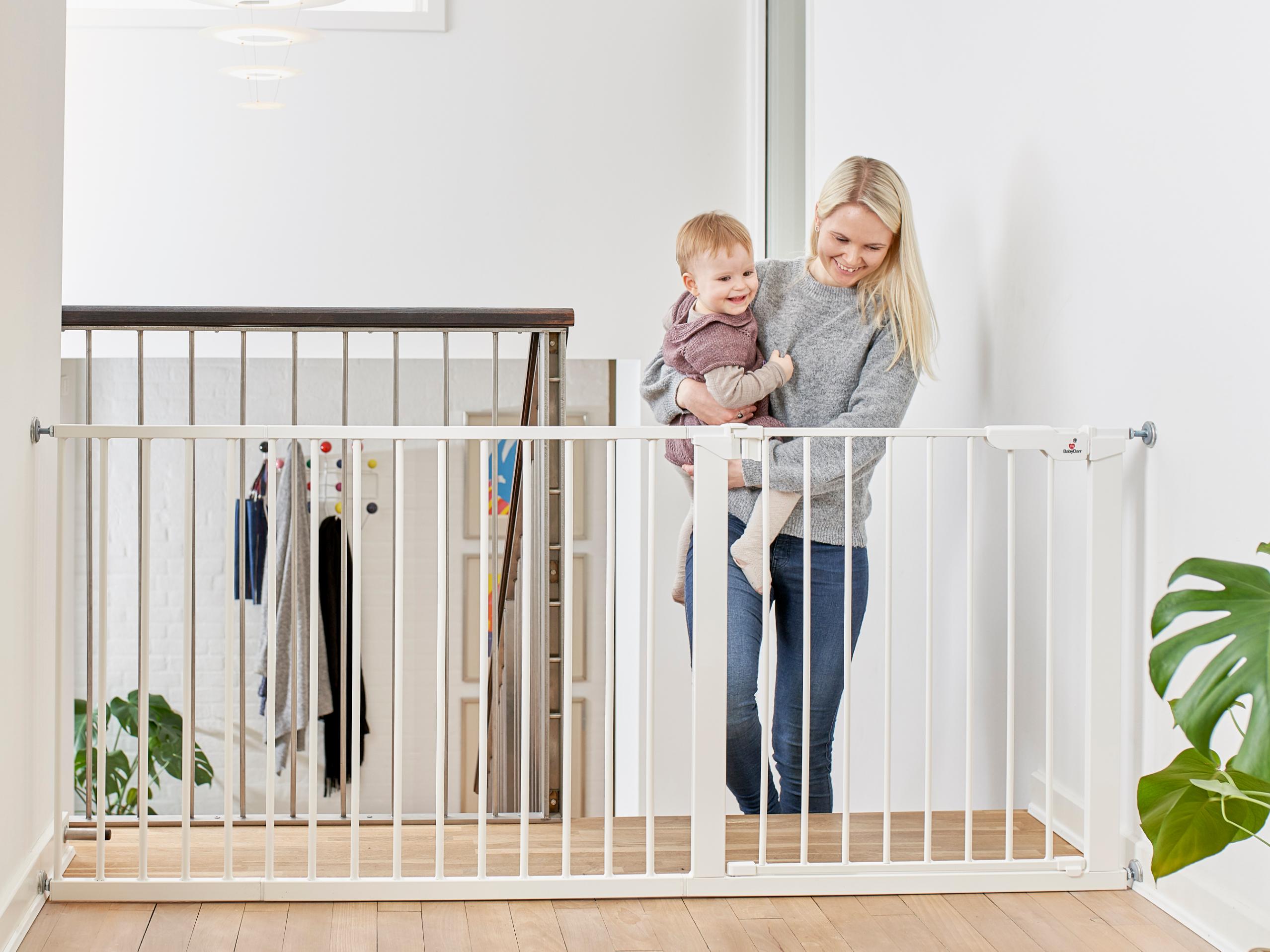 Hvis dere har en trapp hjemme, er det svært viktig å sikre at barnet ikke får tilgang til trappen og risikerer å slå seg. Derfor er det viktig å montere en sikkerhetsgrind ved toppen av trappen, slik at du forhindrer potensielle fallulykker.