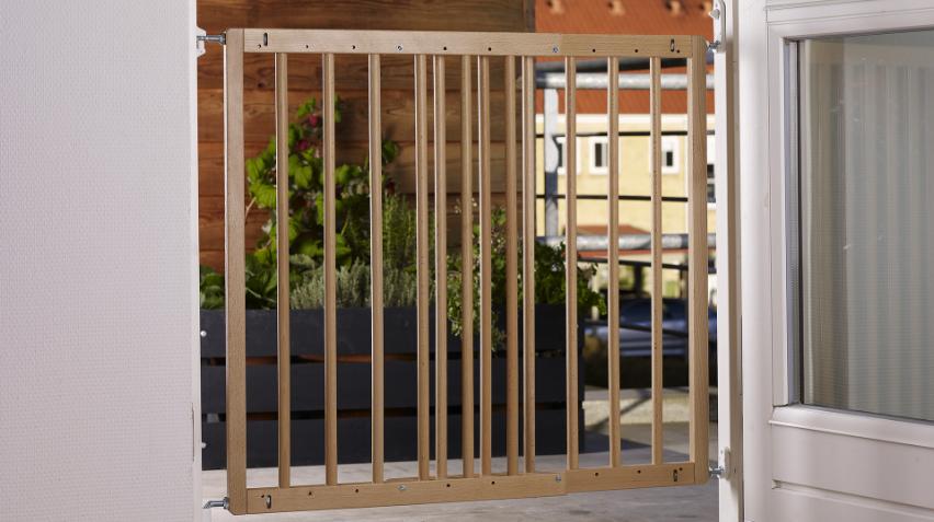 Grinden er veggmontert og må monteres helt ned til gulvet. Det er derfor ingen ramme å snuble over når du passerer grinden.